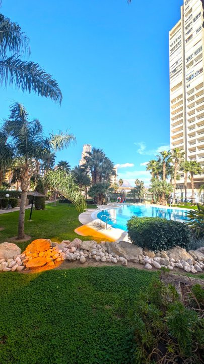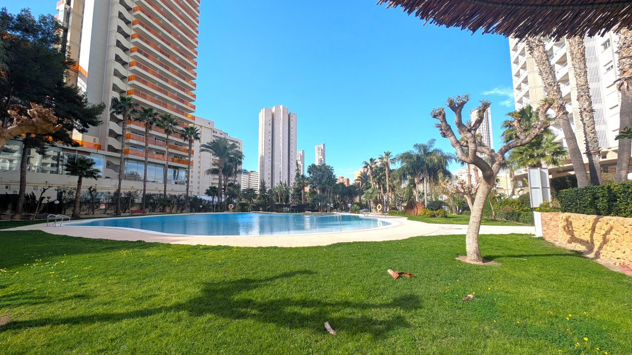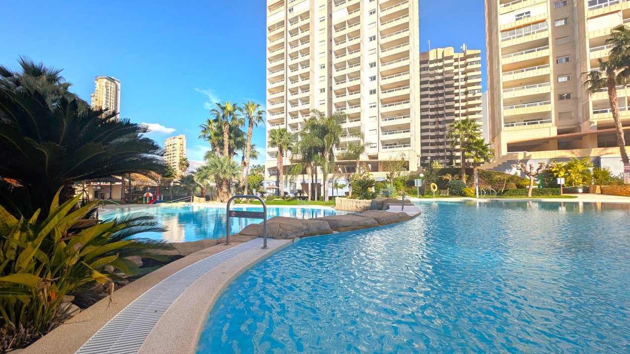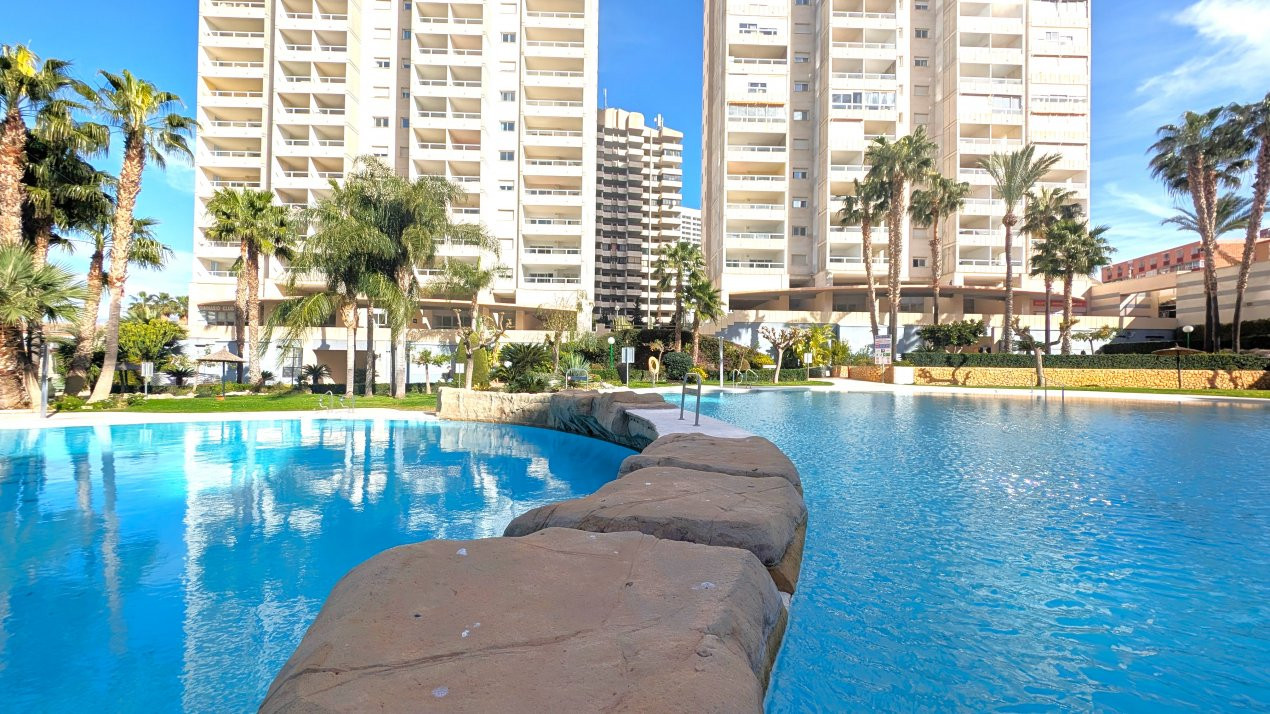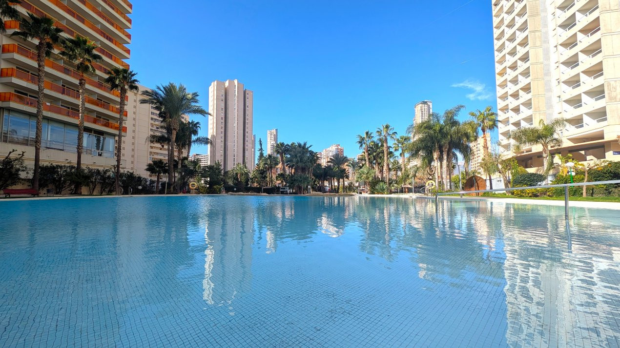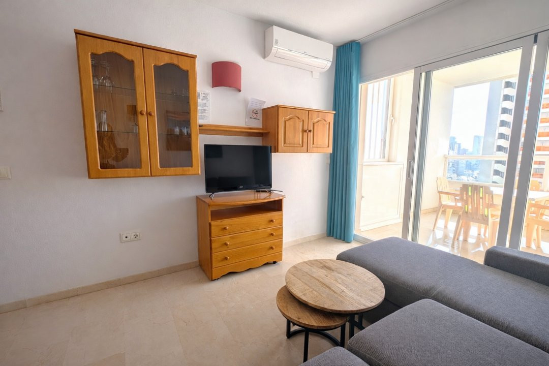 Vă prezentăm în exclusivitate acest apartament elegant cu 1 dormitor, situat la etajul 12 al renumitului complex rezidențial Gemelos 22, unul dintre cele mai bine dotate ansambluri din Benidorm.