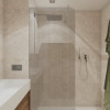 Dușuri moderne cu tăvițe Saloni, paravane din sticlă și faianță texturată în tonuri de fildeș