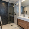 Baie principală: mobilier Jacob Delafon finisaj negru mat cu front din stejar, două lavoare încastrate