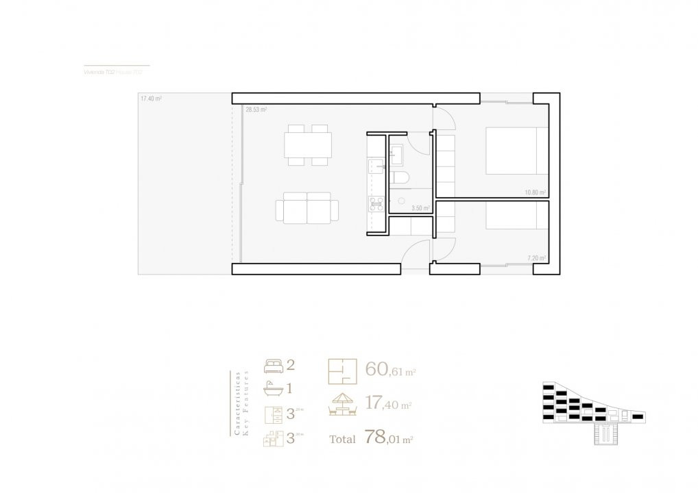 Suprafețele construite variază între 41 m² și 61 m², completate de terase de 17 m² și grădini private de până la 200 m².