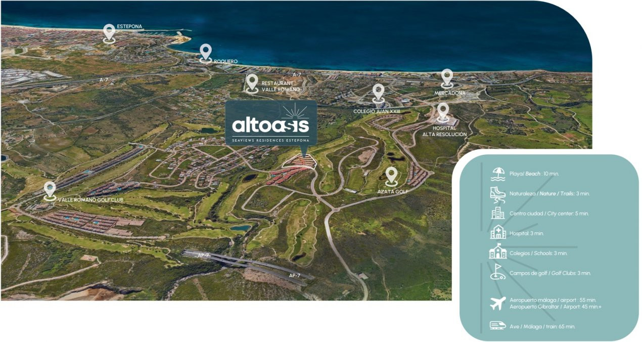 Poziționare strategică, cu acces facil către centrul orașului Estepona, Marbella, Sotogrande și aeroporturile internaționale din Málaga și Gibraltar. Înconjurat de terenuri de golf renumite precum Azata Golf și Valle Romano – ideal pentru pasionați și investitori.